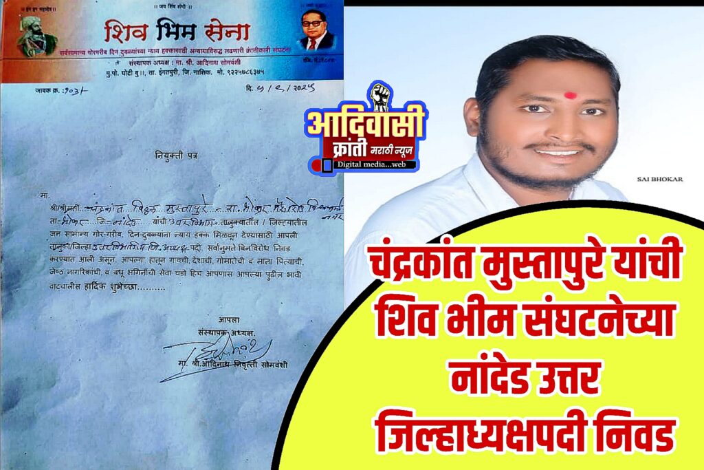 चंद्रकांत विठ्ठल मुस्तापुरे यांची नांदेड उत्तर विभागीय जिल्हा अध्यक्ष पदी म्हणून निवड करण्यात आली आहे तरी त्यांच्या हातून सामाजिक कार्यातून जण सामान्यांच्या न्याय हक्कांसाठी अन्यायाविरुद्ध लढून त्यांना न्याय द्यावा अशी सर्व समाजाचे अपेक्षा उंचावल्या आहेत त्यांच्या पुढील वाटचालीस अनेकांनी शुभेच्छांचा वर्षाव केला त्यांना सोशल मीडियाच्या माध्यमातून व्हाट्सअप फेसबुक प्रत्यक्ष फोन कॉल करून अनेक मान्यवरांनी त्यांना शुभेच्छा देण्यात आल्या व पुढील वाटचालीस अनंत अनंत अशा शुभेच्छा मान्यवराकडून शुभेच्छा देण्यात आल्या